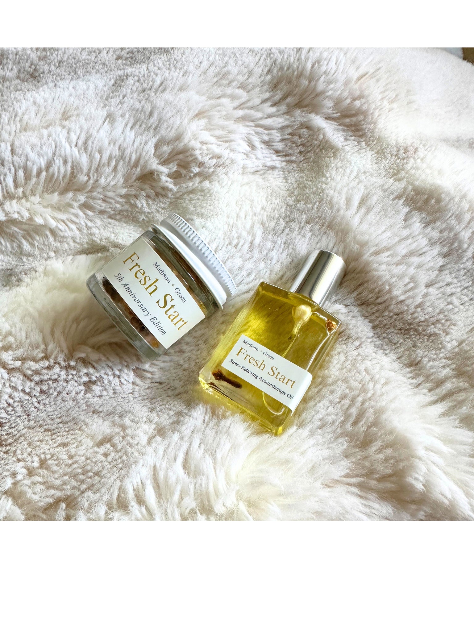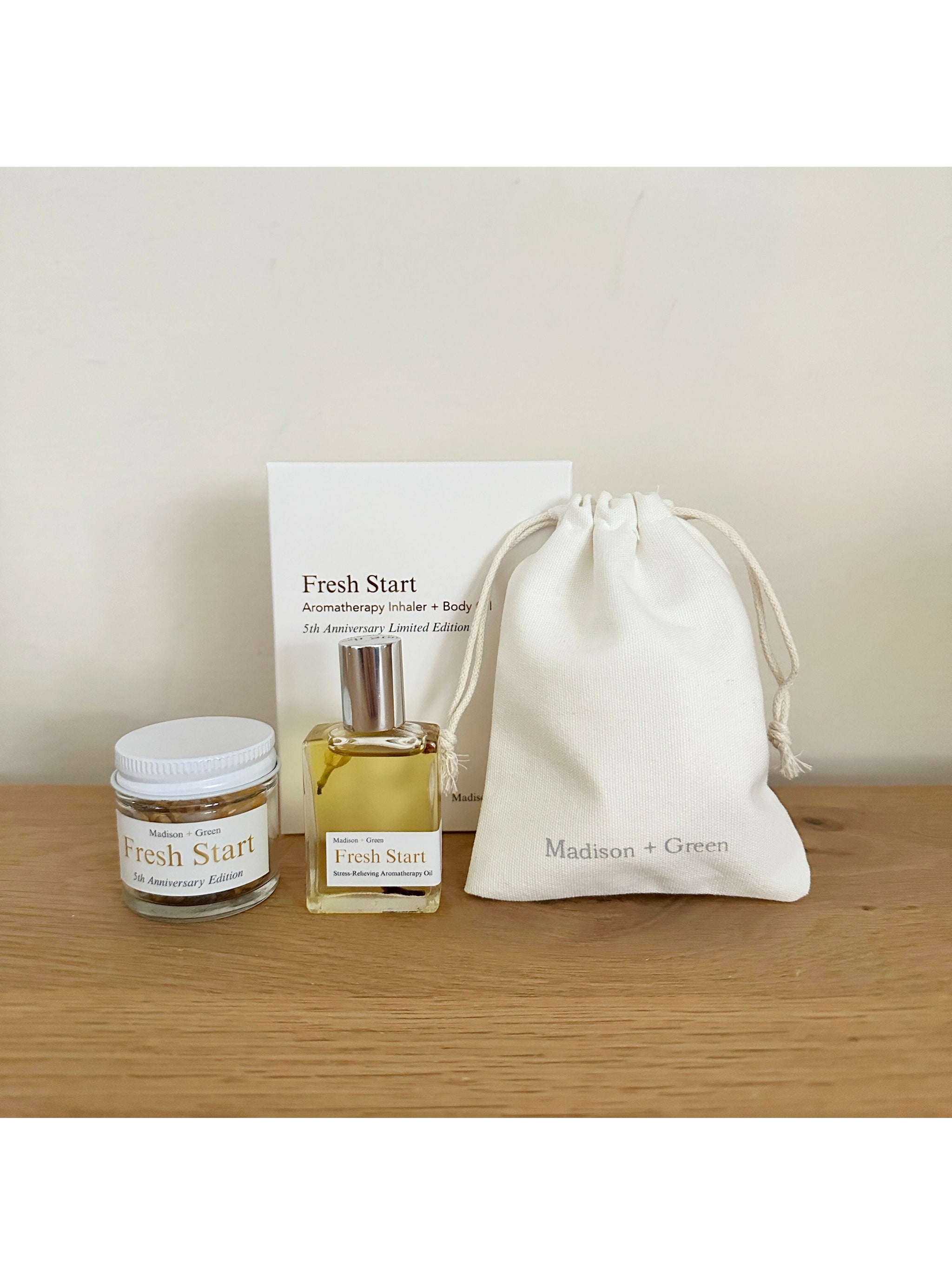 Celebrate our 5th anniversary with a limited-edition “Fresh Start” Aromatherapy Set, thoughtfully designed to honor new beginnings and moments of calm. This exclusive duo features our signature Fresh Start Inhaler—a stress-relieving blend that’s cooling, soothing, and gently stimulating, with the comforting sweetness of geranium. Paired with a luxurious body oil crafted to restore balance and uplift the senses, this special release invites you to breathe deeply, reset, and embrace the beauty of renewal.